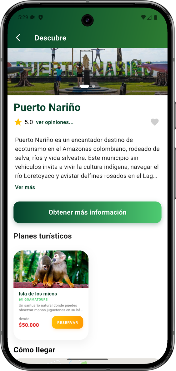 A través de una arquitectura robusta desarrollada en Flutter, creamos GoAma, un ecosistema digital que conecta a los visitantes con la esencia vibrante del Amazonas.